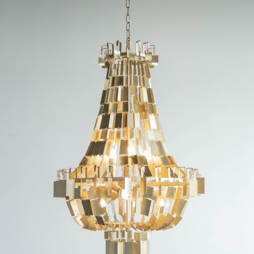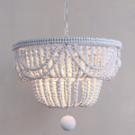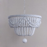 Lampara de madera y bolas blancas.